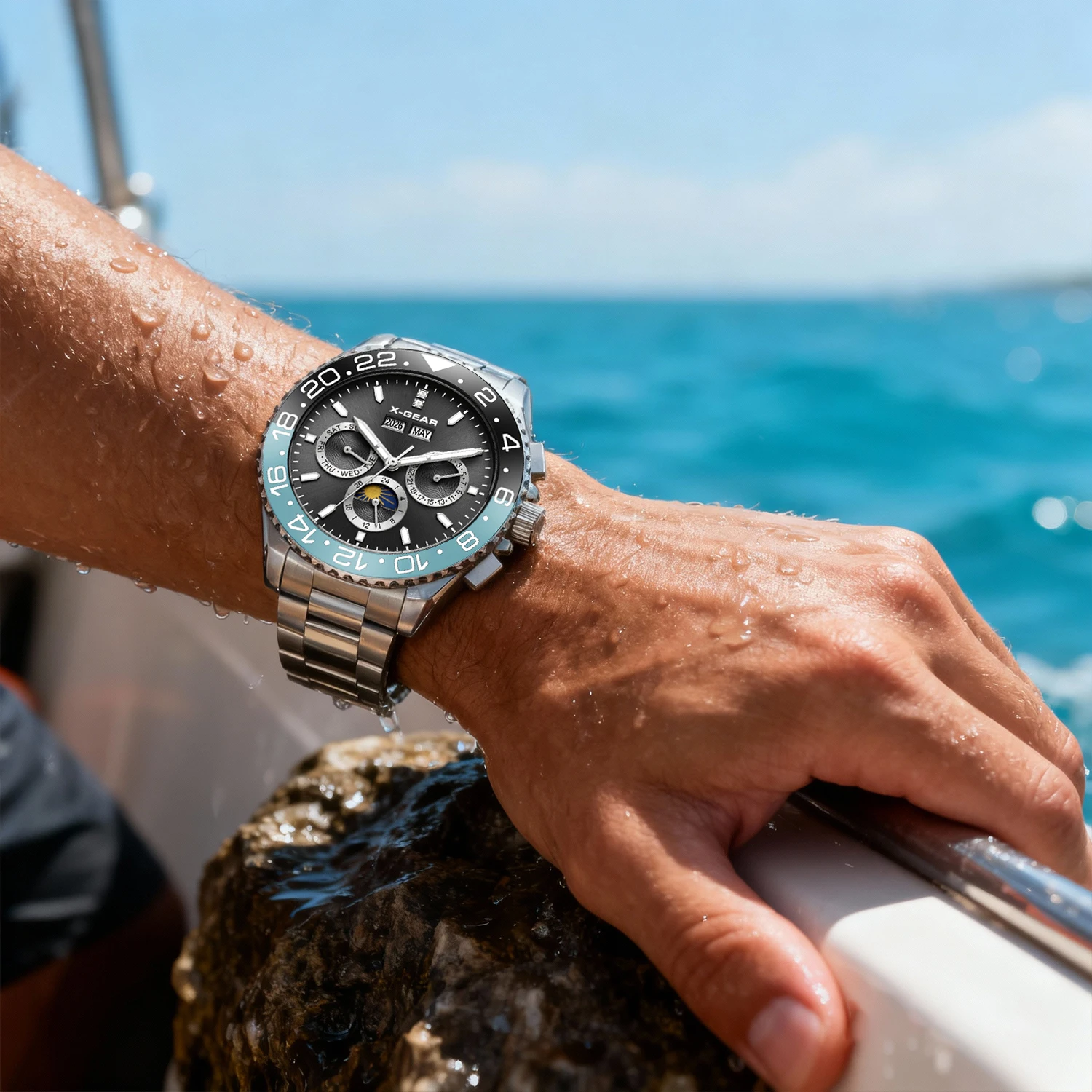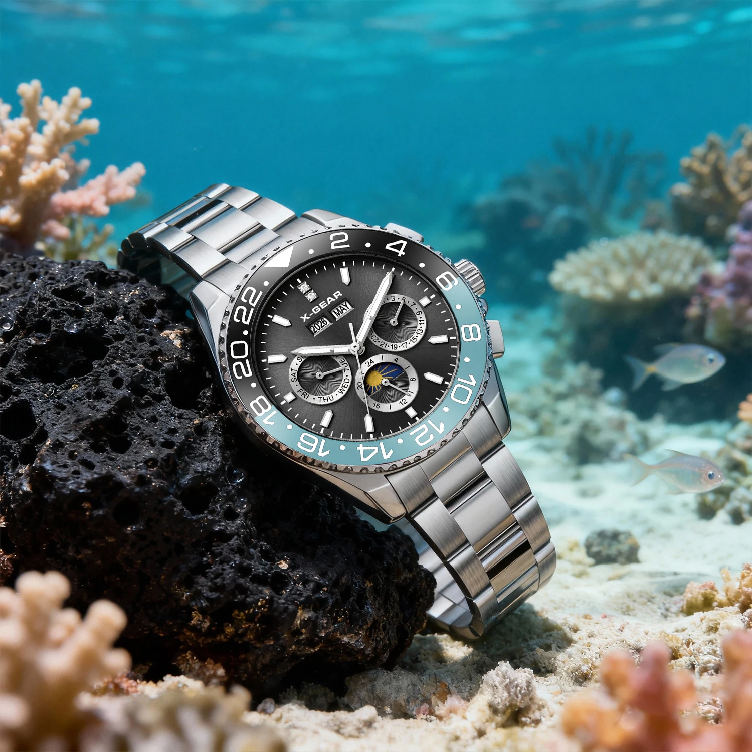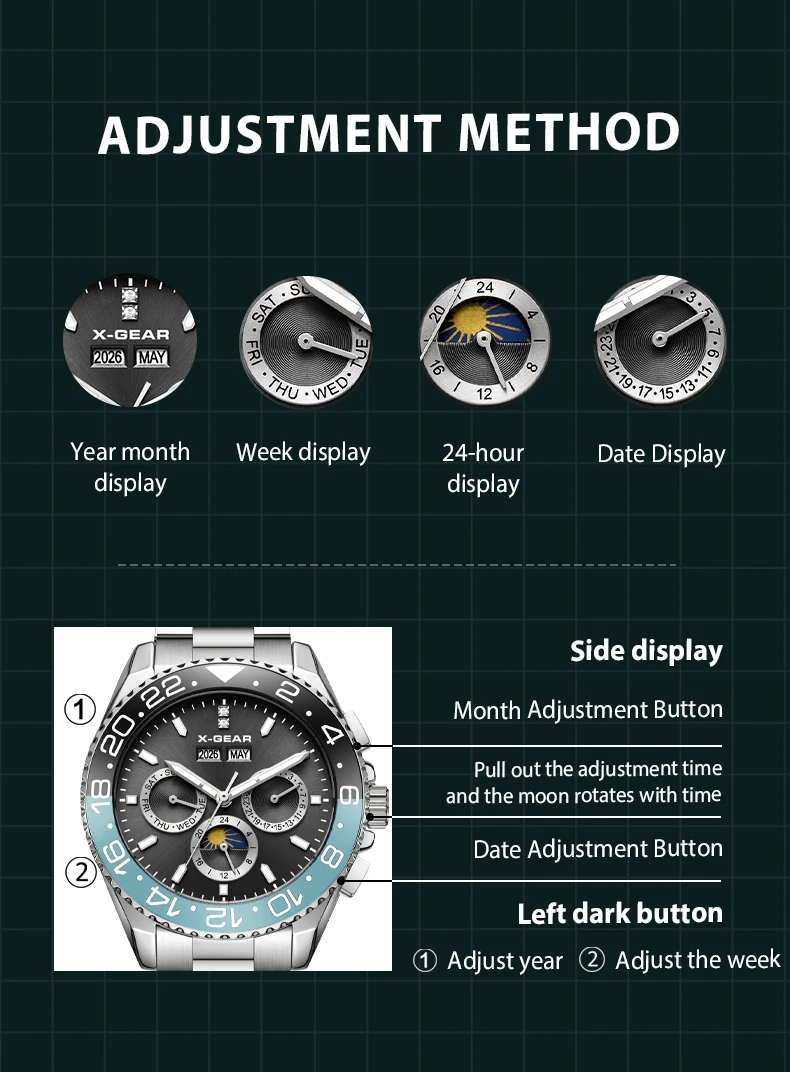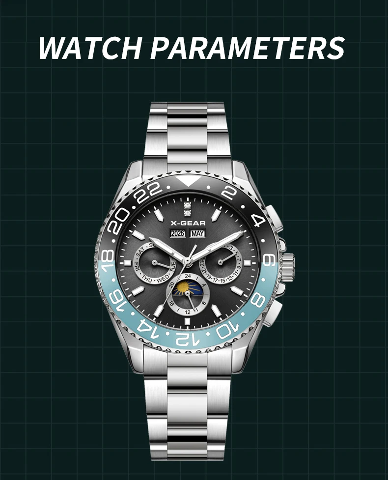 Feature: tourbillon,Luminous,Complete Calendar,Moon Phase,Week Display,water proof,Luminous